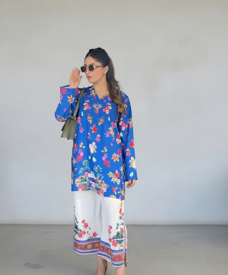 Step into elegance with this stunning royal blue 2-piece ready-to-wear suit. The shirt features a bold floral digital print with vibrant multicolor blossoms that add charm and freshness to your look. Paired with white cambric trousers adorned with matching floral and ethnic borders, this outfit strikes the perfect balance of color and style. Made from soft, breathable fabric, it’s an ideal choice for casual outings, summer gatherings, or semi-formal wear.