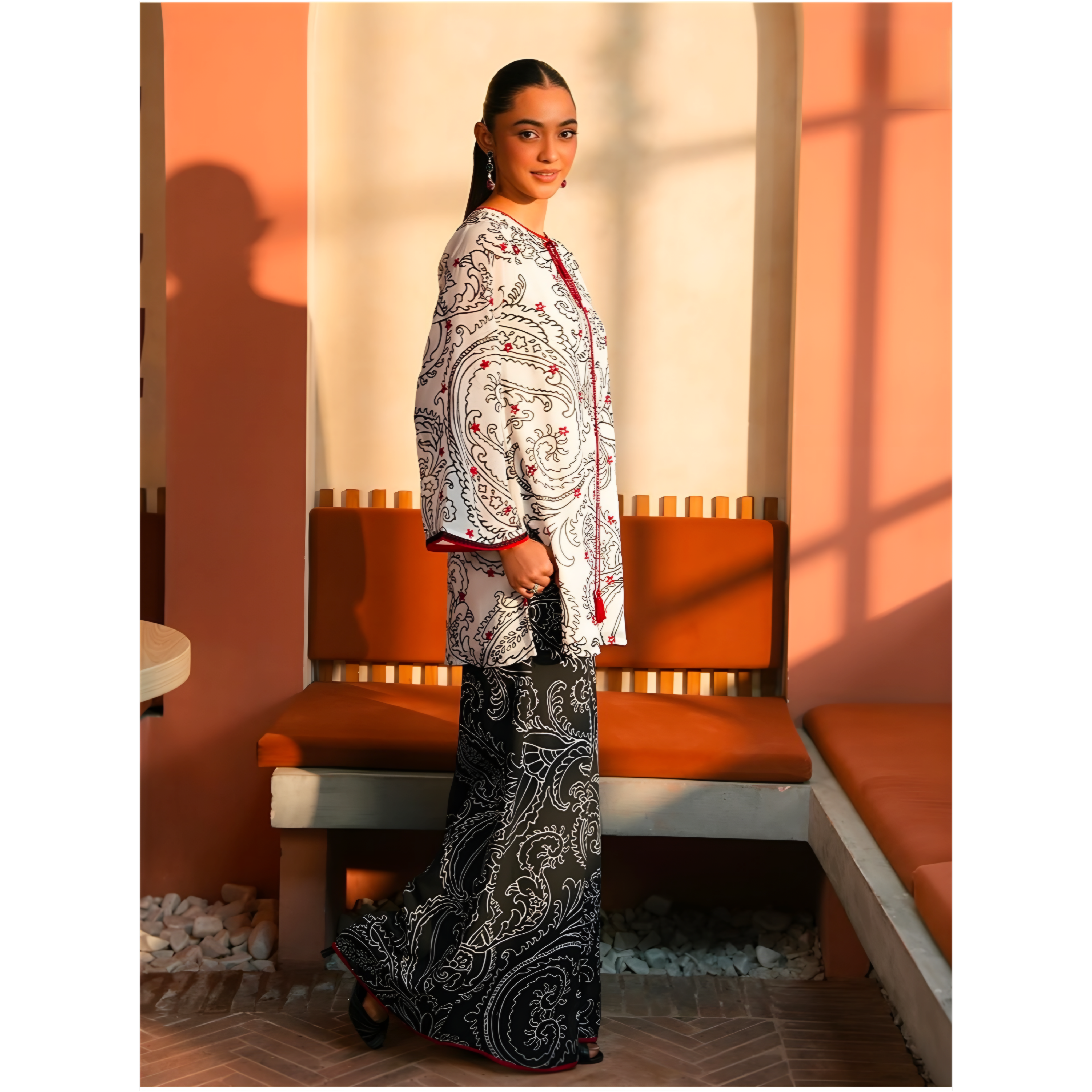 This elegant Three piece outfit blends classic prints with a modern silhouette. The shirt features a striking black and white paisley-inspired design, highlighted with subtle red accents along the neckline and cuffs for a refined contrast. Its relaxed fit and lightweight fabric make it comfortable for all-day wear.