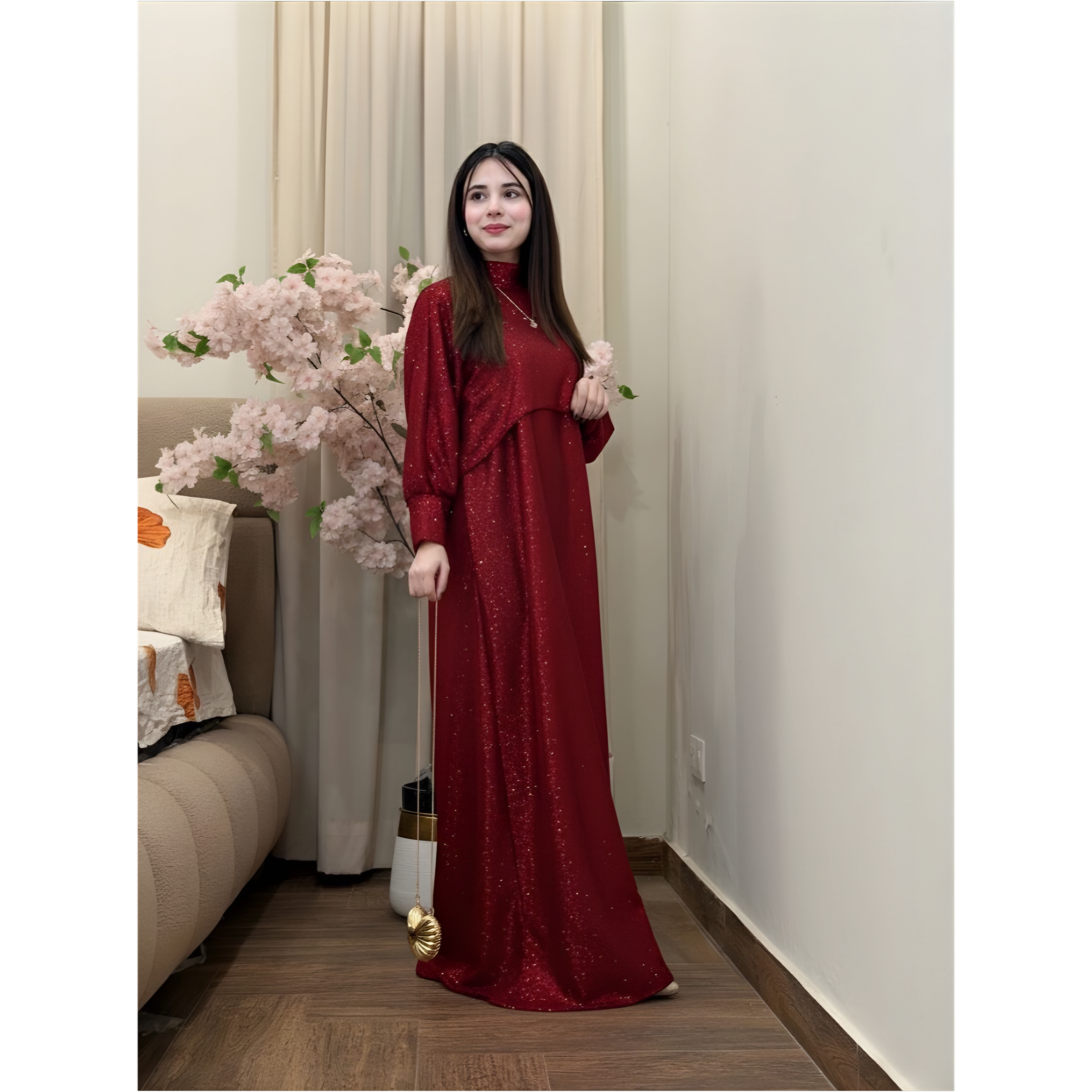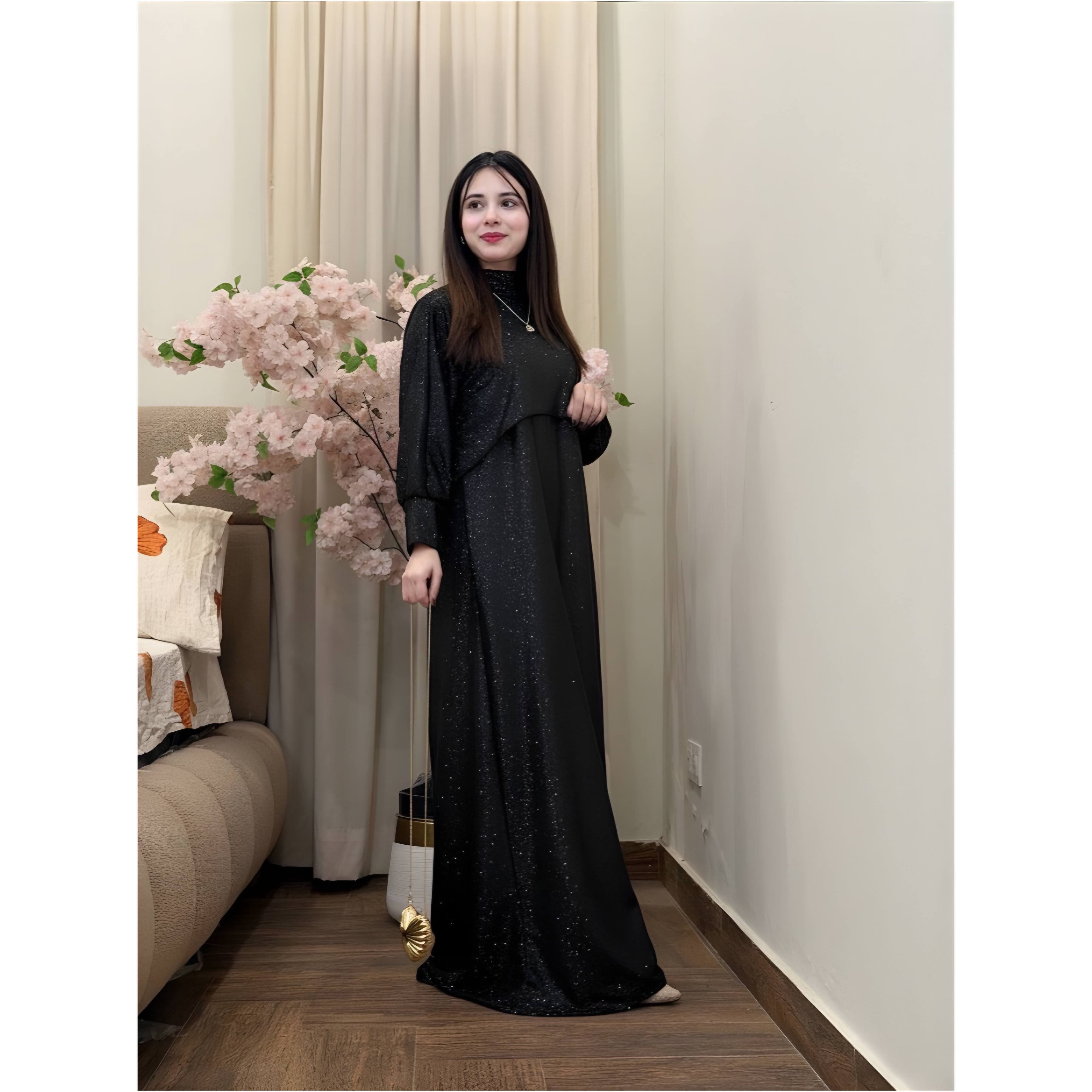 This elegant Glitter Moonlight dress is crafted from Stuff China Glitter Moonlight imported fabric, giving it a soft flow with a subtle, luxurious shine. The fabric feels light on the skin while draping beautifully, making it comfortable for long wear. The modest high-neck design and relaxed silhouette create a graceful look that suits both formal gatherings and special occasions. Finished with delicate glitter detailing, this dress offers a refined balance of comfort and elegance. Perfect for evening wear, festive events, and stylish day functions.