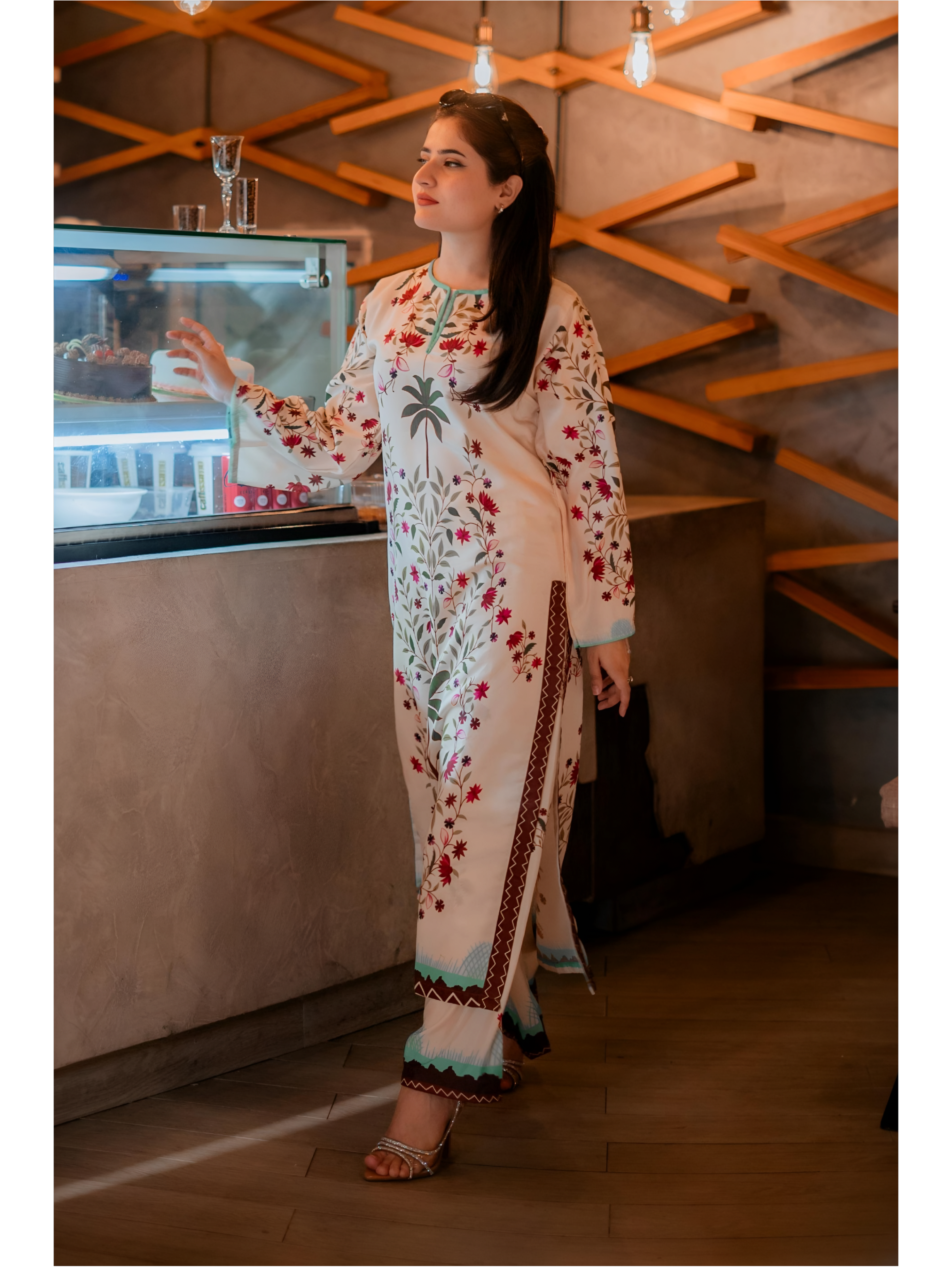 Step out in effortless style with this Ivory Floral Lawn Suit. Featuring a crisp kurta with vibrant floral prints, full sleeves, side slits, and a contrast hem, paired with matching straight-cut trousers. Perfect for casual outings, brunches, or semi-formal occasions.